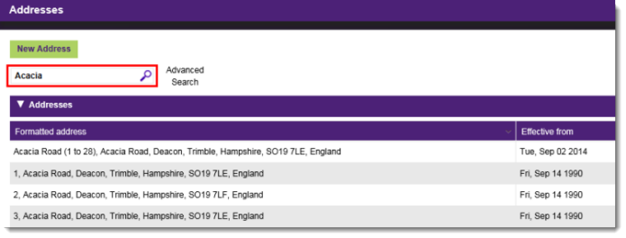 All addresses stored in Civica Cx Housing - contact and asset records alike - can be accessed and updated using a centralised management form. Simply by typing the first few characters of the desired address component into the dynamic search field retrieves all matching records, presented in a scrolling tabular form. Alternatively, an Advanced Search can be performed, across numerous address field components.